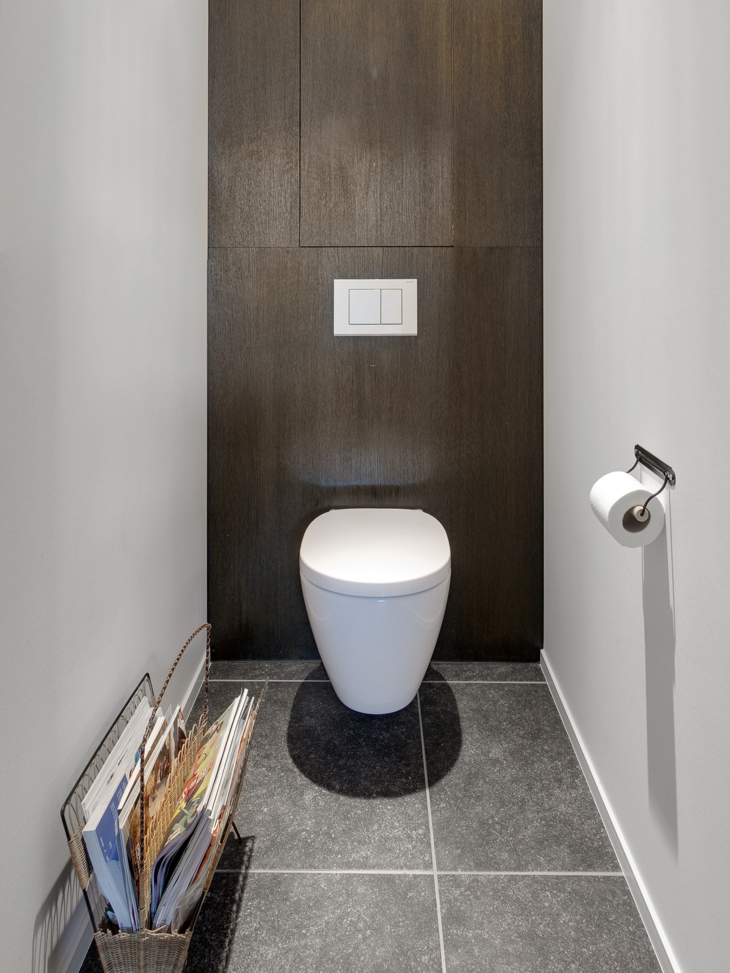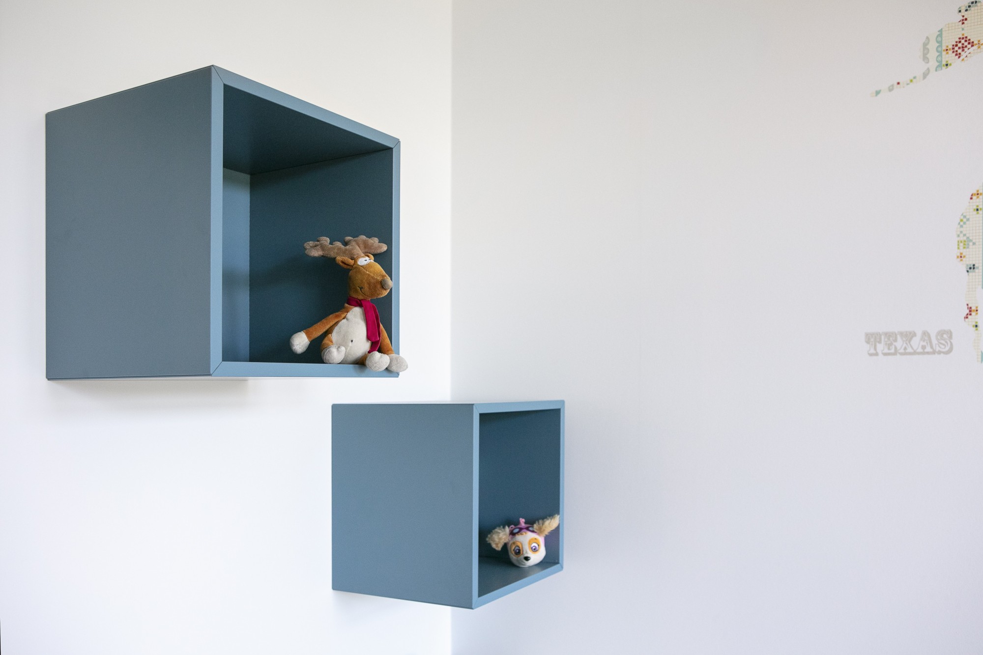 De dakvlakken en een deel van de muren staan in een gebroken wit. Bij het onderste deel van de muur, vloerplinten en kastdeur is er gekozen om dit wat kleur te geven.