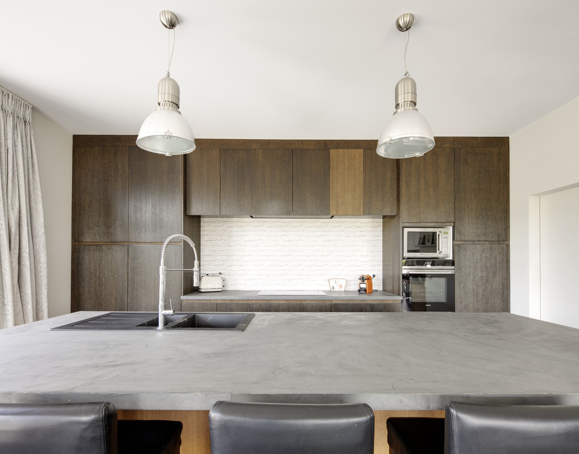 Het beitsen van de houtnerf kastenwand in een donkere kleur. Hangkastjes in een contrast kleur. Let op het baksteen behang achter in de keukenwand, het geeft een subtiel accent in de eethoek.