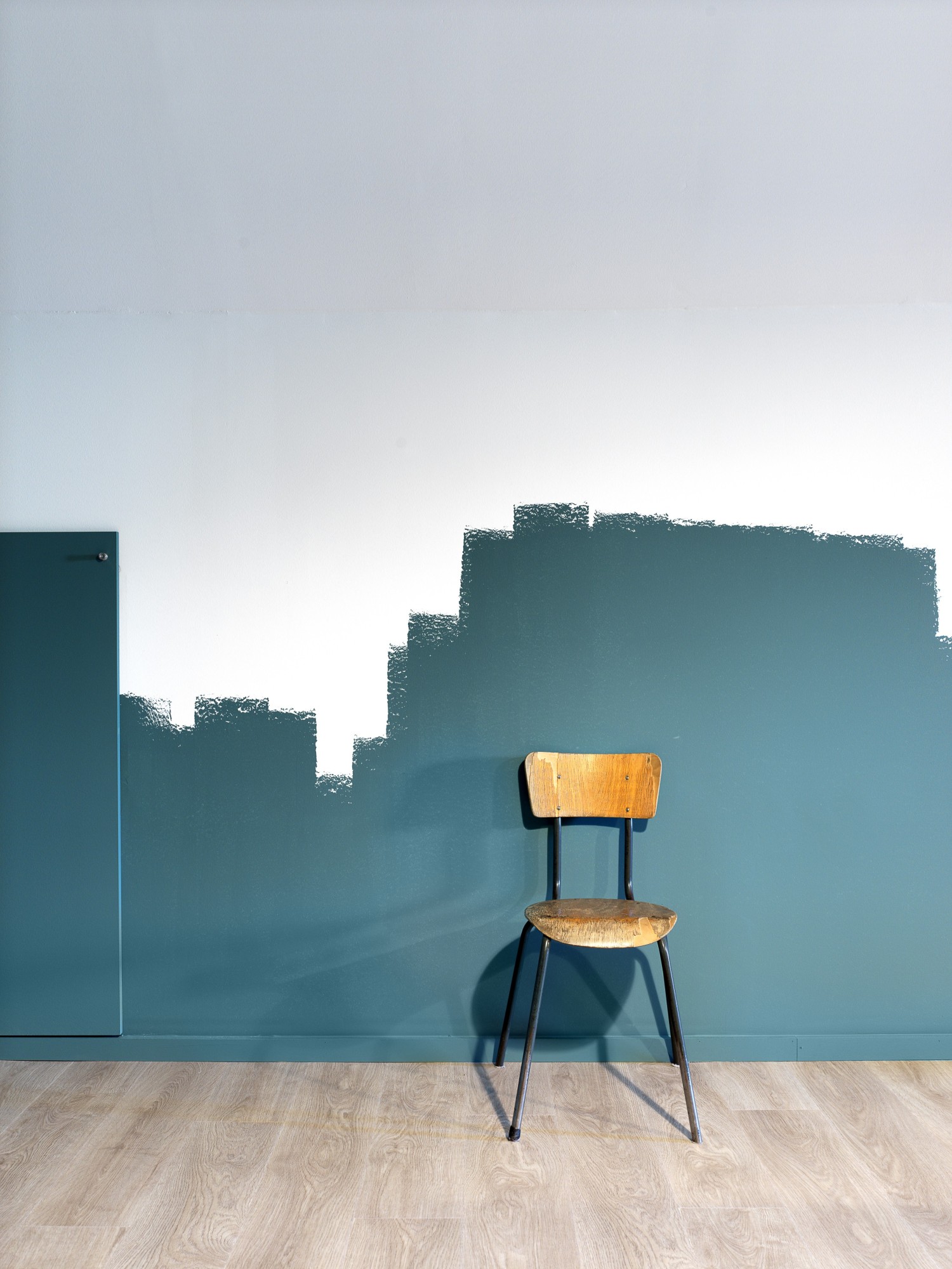 Op de muur met twee kleuren is er niet gekozen voor een rechtlijnige aflijning maar voor een speels verfeffect.